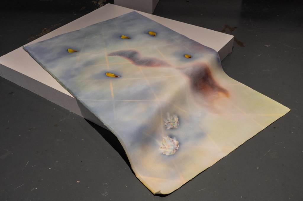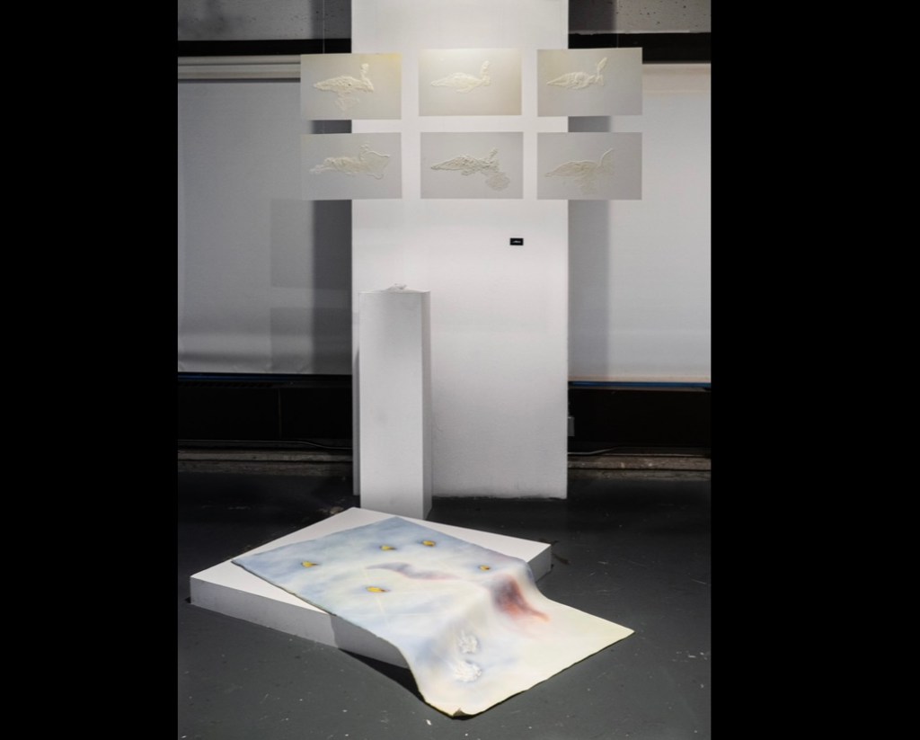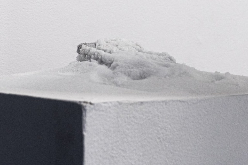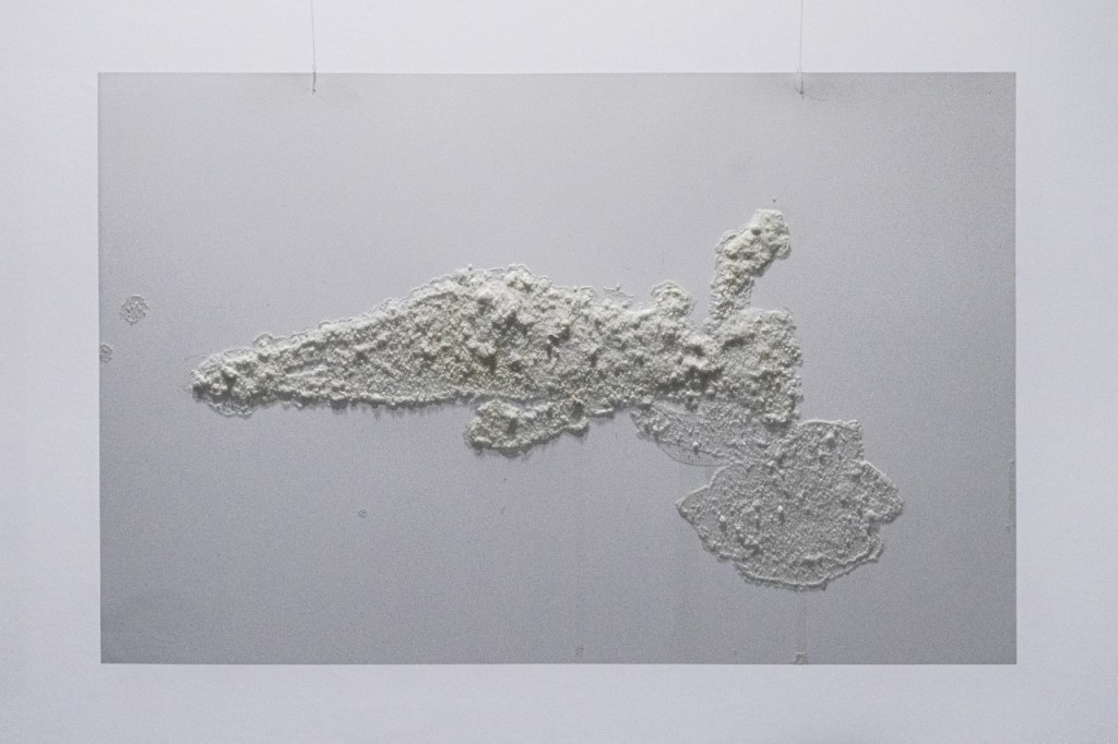 Ce projet fait référence aux pratiques humaines qui aboutissent à la désertification. Ensuite, elle est devenue éternelle, est une installation inspirée d’une photo documentaire. La photo a été prise par un environnementaliste anonyme en Iran. Sur la photo, le corps d’un cerf jaune, une espèce en voie de disparition, est cristallisé dans du sel généré par la sécheresse du lac Urmia. Urmia, l’un des plus grands lacs salés du monde, est en grande partie asséché en raison d’une mauvaise gestion de la distribution de l’eau et de la construction de nombreux barrages sur les rivières environnantes. Le lac abrite de nombreuses espèces et son assèchement constitue un désastre à la fois politique et environnemental. Au milieu du récent soulèvement en Iran, où les gens documentaient des scènes avec leurs téléphones portables, j’ai trouvé un lien métaphorique entre tous ces événements. Il semble que tous les éléments, humains et non humains, aient voulu enregistrer ce moment historique à travers leur corps, pour en faire un témoignage pour l’avenir. Aussi ce corpus fait référence au processus de l’extraction de lithium qui est une matière essentielle pour des batteries des appareils technologiques. Lithium se trouve souvent dans l’eau salée et pour l’extraction, il faudrait évaporer l’eau.