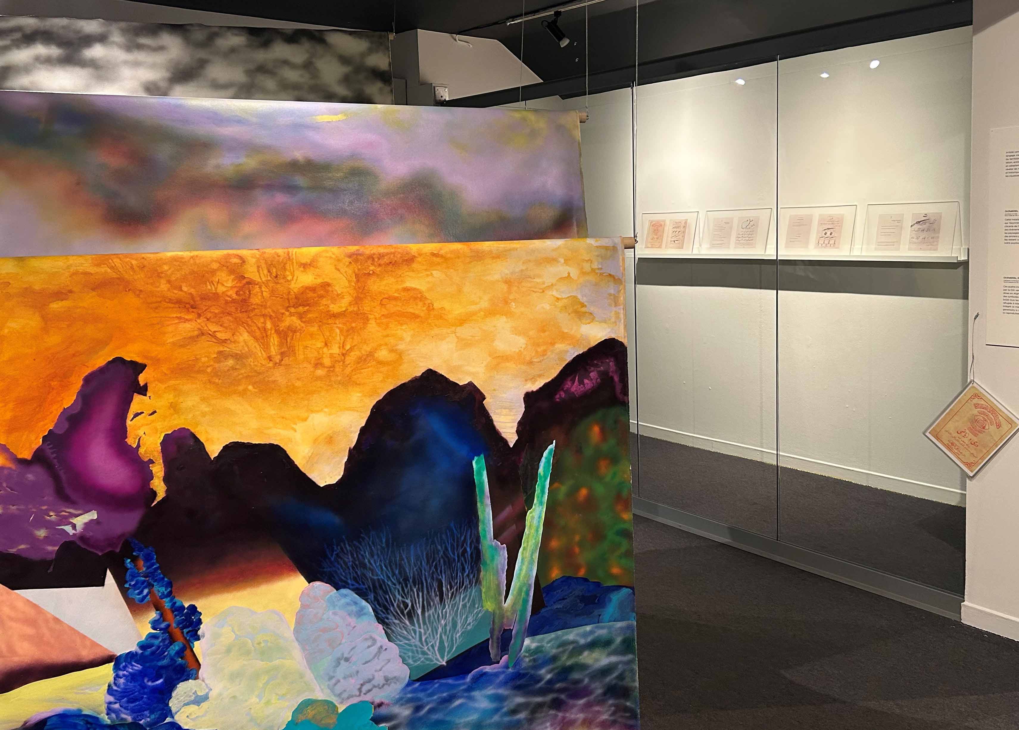 (un)inhabited). This body of work focuses on processes and activities that formed our so-called contemporary landscape. It consists of three parts. The main artwork is an installation consisting of two large, suspended paintings. Some areas of the installation are intentionally hidden or less accessible for the visitors. Also, I have presented some reproduction of El Idrisi’s 12.c maps in the form of flags. Without these maps it would be difficult to imagine the colonial capitalist world in the coming centuries. The maps and book pages are presented as two examples of western-led activities which have major and long-term impacts on the socio-political and natural landscape. Acrylic Paint on Canvas. Digital Print on plexiglass. Digital Print on fabric. 2022. Centre Auger. Quebec. Canada. Photo: Courtesy of the artist.