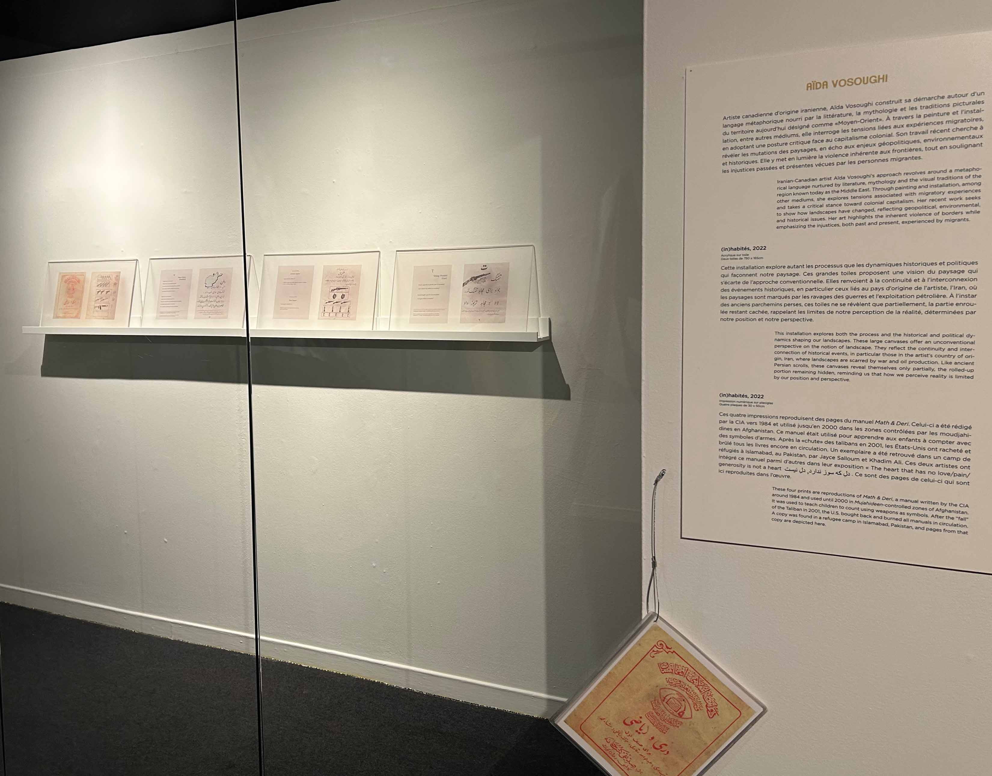(in)habités. Ce corpus d’œuvres se concentre sur les processus et activités historiques et politiques qui ont formé notre soi-disant paysage contemporain. Il se compose de trois parties. L’œuvre principale est une installation composée de deux grandes peintures suspendues. Certaines parties de l’installation sont intentionnellement cachées ou moins accessibles aux visiteurs. J’ai également présenté des reproductions des cartes 12.c d’El Idrisi sous la forme de drapeaux. Sans ces cartes, il serait difficile d’imaginer le monde capitaliste colonial des siècles à venir. Les cartes et les pages du livre sont présentées comme deux exemples d’activités menées par l’Occident qui ont un impact majeur et à long terme sur le paysage sociopolitique et naturel. Peinture acrylique sur toile. Impression numérique sur plexiglas. Impression numérique sur tissu. 2022. Centre Auger. Québec. Québec, Canada. Photo de l’artiste : Avec l’aimable autorisation de l’artiste.