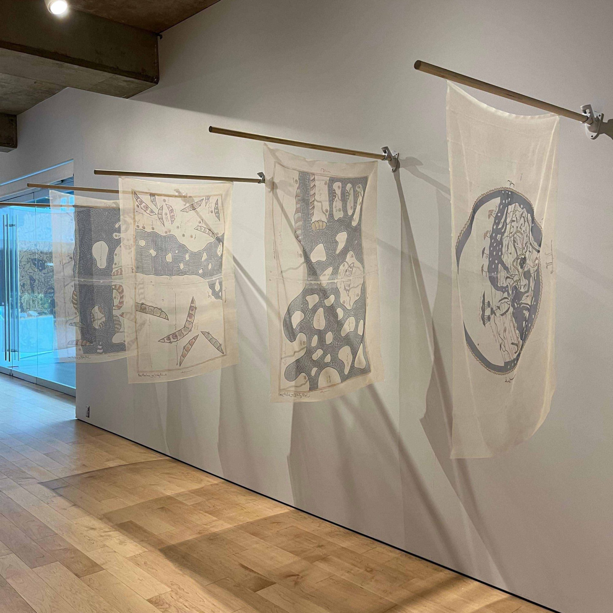 (in)habités. Ce corpus d’œuvres se concentre sur les processus et activités historiques et politiques qui ont formé notre soi-disant paysage contemporain. Il se compose de trois parties. L’œuvre principale est une installation composée de deux grandes peintures suspendues. Certaines parties de l’installation sont intentionnellement cachées ou moins accessibles aux visiteurs. J’ai également présenté des reproductions des cartes 12.c d’El Idrisi sous la forme de drapeaux. Sans ces cartes, il serait difficile d’imaginer le monde capitaliste colonial des siècles à venir. Les cartes et les pages du livre sont présentées comme deux exemples d’activités menées par l’Occident qui ont un impact majeur et à long terme sur le paysage sociopolitique et naturel. Peinture acrylique sur toile. Impression numérique sur plexiglas. Impression numérique sur tissu. 2022. Centre Auger. Québec. Québec, Canada. Photo de l’artiste : Avec l’aimable autorisation de l’artiste.